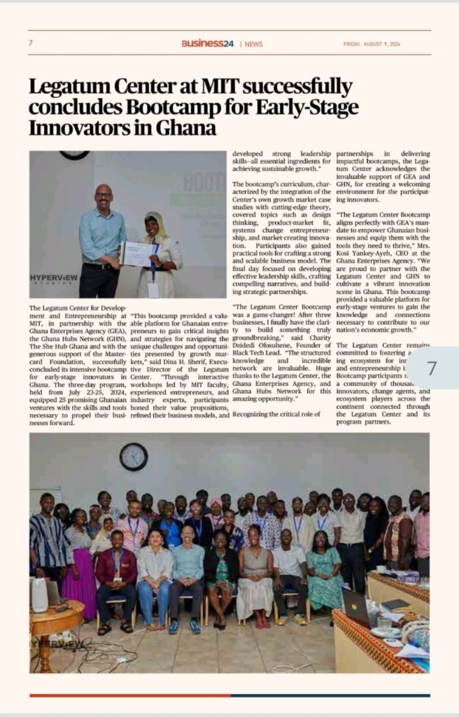 “The bootcamp provided a valuable platform for Ghanaian entrepreneurs to gain critical insights and strategies for navigating the unique challenges and opportunities presented by growth markets,” said Dina H. Sherif, Executive Director of the Legatum Center. “Through interactive workshops led by MIT faculty, experienced entrepreneurs, and industry experts, participants honed their value propositions, refined their business models, and developed strong leadership skills—all essential ingredients for achieving sustainable growth.”